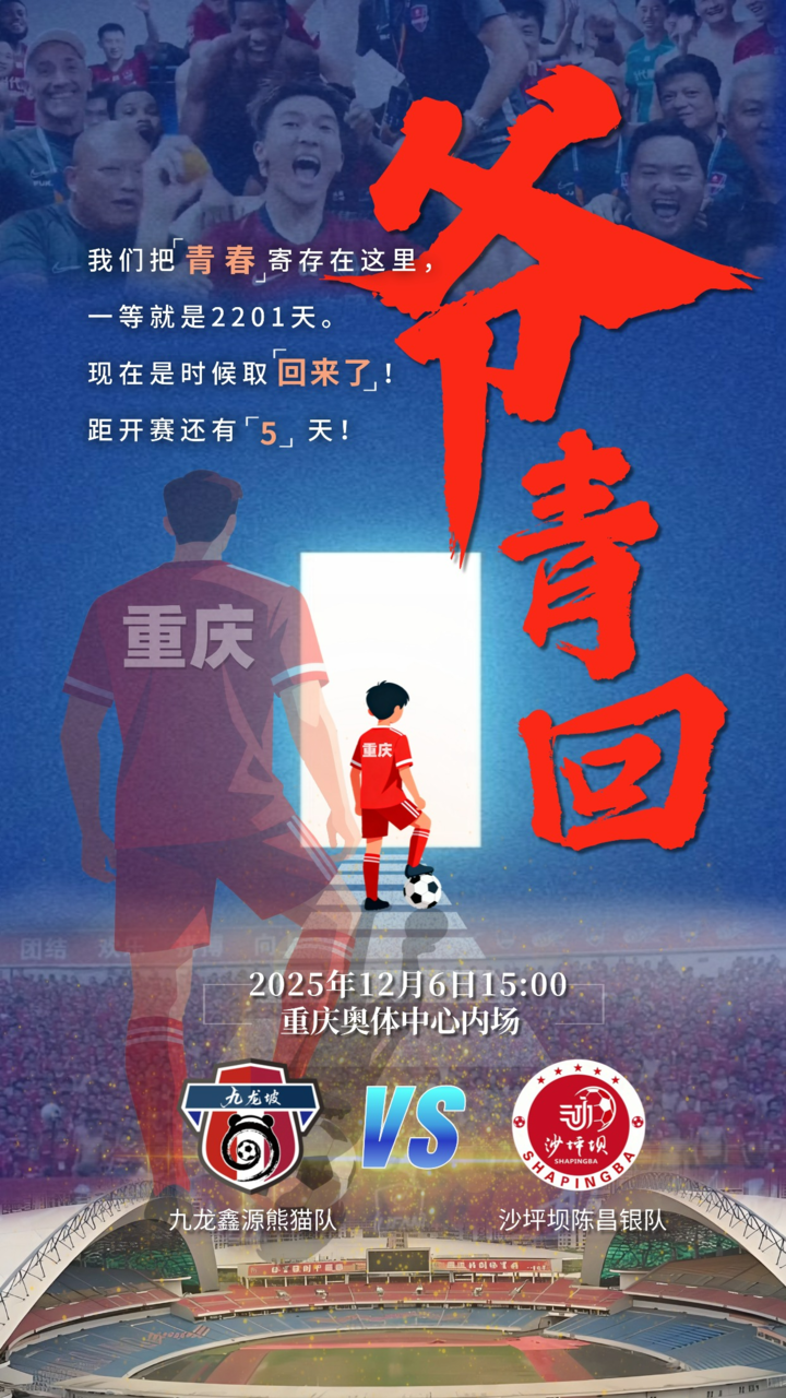 “新韵重庆 渝超同行”2025重庆城市足球超级联赛中心城区赛区传来重磅消息——阔别2201天,12月6日下午3点,九龙坡区首个主场对决将在重庆奥体中心开战,九龙鑫源熊猫队将迎战沙坪坝陈昌银队,这场承载着九龙坡足球热情的赛事,不仅将点燃重庆奥体中心的绿茵激情,更准备了多重福利与惊喜抽奖,邀全市球迷共赴足球狂欢。
