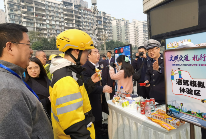 演出结束后,现场各个具有特色的互动体验区将气氛推向高潮。在事故预防大队的展台前,蛋黄派、醪糟、啤酒、藿香正气水一字排开,“这活动搞得好,还有小吃和应急药品……”这可不是冷餐台,而是最生动的酒驾测试体验,外卖骑手饶国正在吃掉一个蛋黄派后,经过民警的呼吸式酒精测试,显示数值为12mg/100ml,虽未达到酒驾标准,但在得知小哥经常因为送餐忙而吃几个蛋黄派充饥后,民警还是暖心地提醒他,如果一口气吃得较多,体内酒精含量可能在短时间内较高,建议休息一会儿后再驾车,何况在外辛苦,务必要注意好好吃饭。