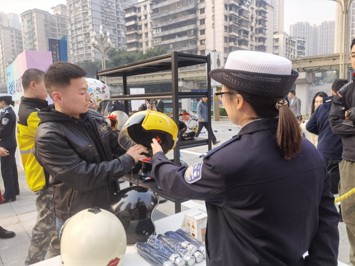 ▲在头盔展示体验区,民警讲解头盔的防护原理与正确佩戴方式,让市民了解安全头盔的重要性。