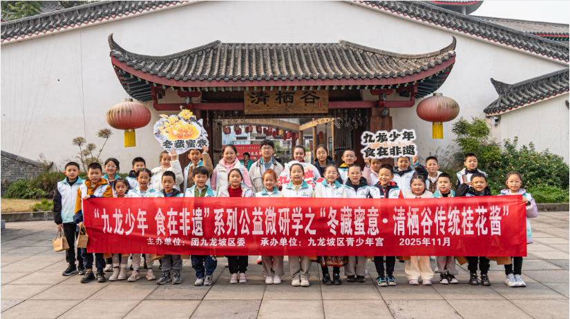 九龙融媒讯(记者 范坤民)11月30日,团区委、区青少年宫开展的“九龙少年 食在非遗”系列公益微研学走进清栖谷,30名青少年在初冬时节体验“冬藏蜜意”的传统智慧,从溯源桂花酱的历史文化,到亲手酿制一罐属于自己的甜蜜,孩子们在动手实践中不仅封存了季节的芬芳,更真切触碰到非遗鲜活温热的传承脉动。