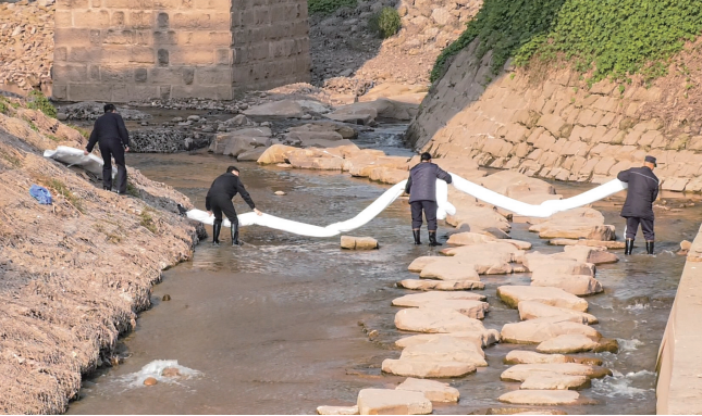 现场处置组根据平台指引,迅速定位泄漏点,按照“先控源、后处置”的处置流程,采用沙袋围堵、专业封堵器材作业等方式,迅速遏制污染物扩散态势。现场处置人员同步调用抽吸车、拦污索、吸油毡等专业设备,对已泄漏污染物实施分区围隔、集中抽吸回收,全过程规范记录处置流程与物资使用情况,确保处置工作科学高效、有据可查。