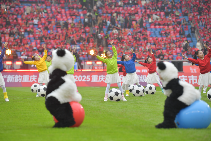 暖场环节中,由区文化馆抱抱艺术团倾力打造的节目《抱抱地球》惊艳亮相。这支曾荣登央视六一晚会、重庆市团拜会的优质团队,携手重庆动物园的熊猫元素,让天真烂漫的小朋友们与圆滚滚的熊猫玩偶在绿茵场上相拥互动,用纯真的表演勾勒出温暖画卷,为冬日赛场注入浓浓暖意。“既有足球的热血,又有这样治愈的表演,太有心了!”现场球迷纷纷举起手机记录这一温馨时刻。
