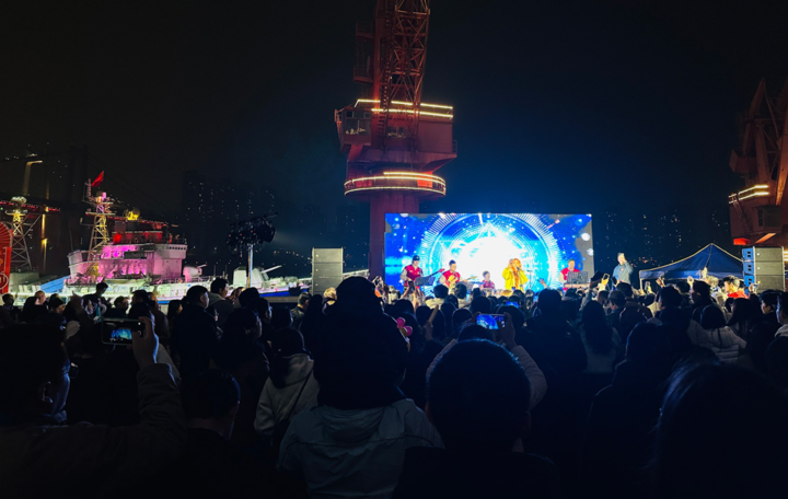 随着终场哨声响起,海疆博览园九龙渡口码头的第二观赛现场热度丝毫未减。文旅公司紧扣“渝超”赛事流量契机,在观赛活动结束后无缝衔接推出球迷音乐会,以“重庆野歌会”为主题的演出随即拉开帷幕。本土音乐人轮番登台,用充满地域特色的旋律点燃全场,球迷们从赛事的激情中延续热情,或跟唱经典曲目,或挥舞荧光棒互动,现场氛围持续升温。