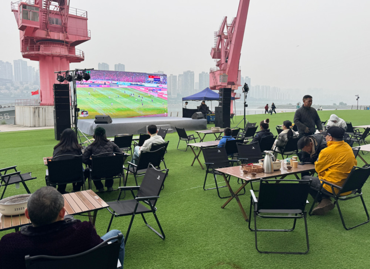 走进海疆博览园九龙渡口码头的观赛区,巨大的LED屏幕前,聚集了众多球迷和游客。每当场上队员完成一次抢断或发起一次进攻时,这里便爆发出丝毫不逊于主场的“雄起”声浪。今天的海疆码头连接着赛场内外:一边是球员们将“大美九龙,渝超争雄”的口号化为每一次拼搏;另一边,是第二现场的球迷们在每一次欢呼中,感受着来自家乡球队的硬核底气与人文温度。