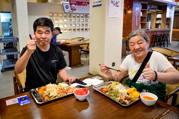 ▲在民主村社区老年食堂用餐的居民,竖起大拇指点赞食堂服务。 记者 曹鸣鸥 摄