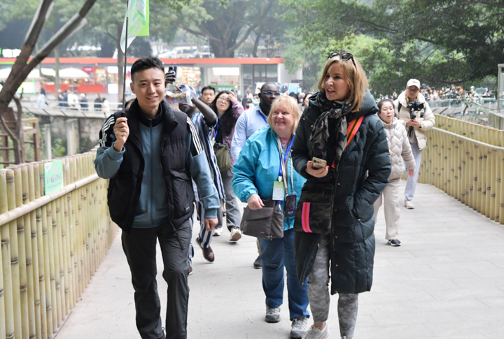 上午9时许,考察团首先抵达重庆动物园。作为重庆市民熟知的“城市生态名片”,园内葱郁的植被与灵动的动物群落相得益彰。客商们沿着游览线路漫步,不时驻足观察大熊猫、金丝猴等特色动物的生活状态,纷纷举起手机拍摄记录。一位来自德国的客商表示:“重庆动物园的环境很舒适,动物们看起来状态很好,这种人与自然和谐共处的氛围,让我感受到了重庆这座城市的温柔与活力。”
