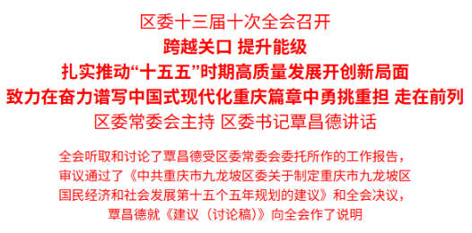 全会高度评价“十四五”时期九龙坡经济社会发展取得的重大成就。“十四五”时期是九龙坡发展史上具有里程碑意义的五年。习近平总书记亲临重庆视察并发表重要讲话,为现代化新重庆建设标定了时代坐标、注入了强大动力。期间,习近平总书记亲临民主村社区调研并作出重要指示,提出“中国式现代化,民生为大”重大论断,为现代化九龙坡建设指明了前进方向、提供了根本遵循。区委始终牢记习近平总书记殷殷嘱托,坚决贯彻党中央决策部署和市委工作要求,团结带领全区上下统筹推进经济社会发展各项任务,致力在全市做实“两大定位”、发挥“三个作用”,奋力谱写中国式现代化重庆篇章中勇挑重担、走在前列,融入和服务国家重大战略取得显著成效,重庆枢纽港产业园九龙新城建设拓展发展空间,现代化产业体系建设迈出坚实步伐,科技创新发展积蓄强劲动能,数字重庆建设赋能全面深化改革取得重大进展,城市现代化治理加快探索,新时代文化强区建设深入推进,“九治一体、九龙九美”美丽九龙坡建设走深走实,“中国式现代化,民生为大”深入践行,全面从严治党纵深推进,现代化九龙坡建设迈出坚实步伐。