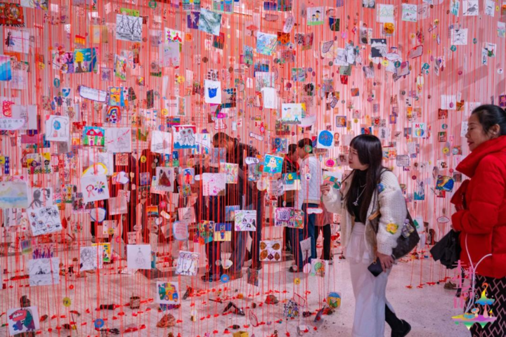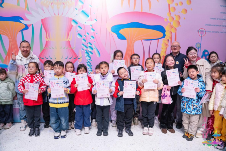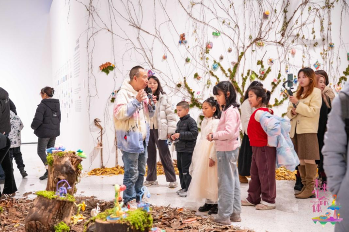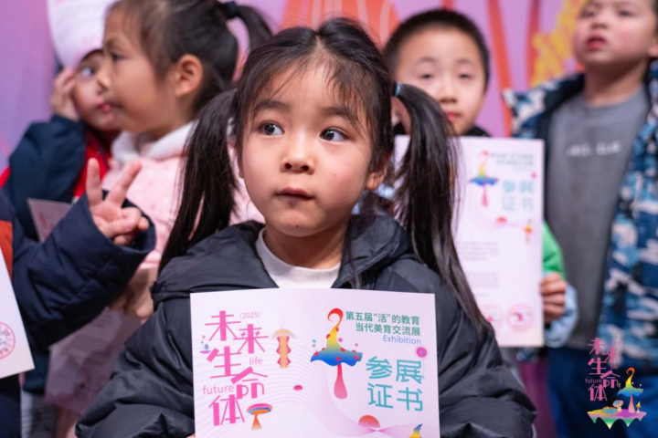 展览的一大亮点是真正以儿童为主体。开幕式上,9岁的学生代表彭艺涵分享了她在“活”的教育氛围中的学习感受。一位4岁学员的家长也作为代表发言,谈及在“即享时代”如何通过理解、陪伴与呵护,守护孩子的鲜活创意。开幕式现场吸引了100余组家庭,孩子们在展厅中兴奋地寻找自己的作品,并获得了参展证书。