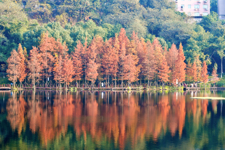 当前,彩云湖国家湿地公园的水杉已换上冬日“盛装”,从翠绿到金黄,再到橘红、锈红,层层叠叠的色彩如同大自然打翻了调色盘,偶尔有白鹭掠过水面,为这份热烈添了几分灵动。