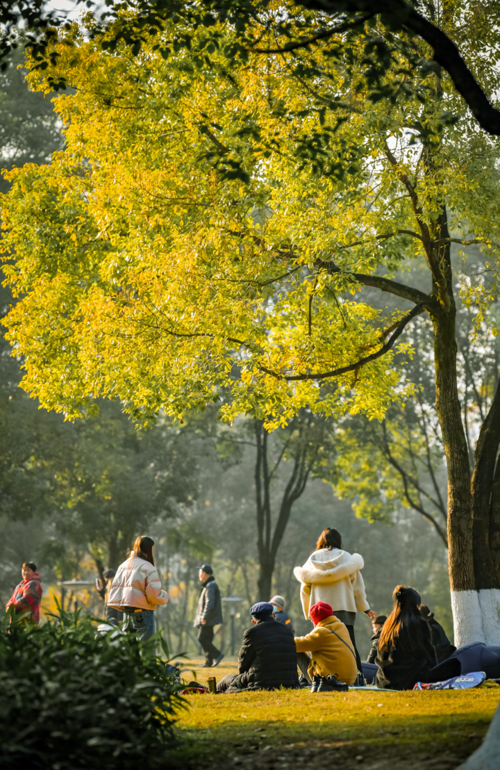 ▲市民在彩云湖健康主题公园里席地而坐,沐浴暖阳。