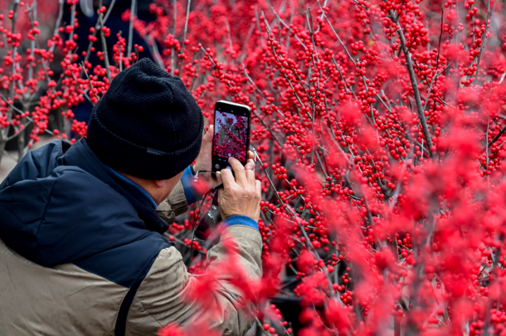 ▲华岩旅游区内,游客在“冬青”制造的红色“海洋”中拍照。
