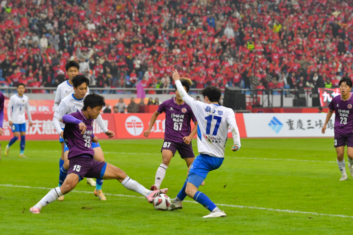 2025年12月6日,重庆奥体中心,足球赛场拼抢瞬间。