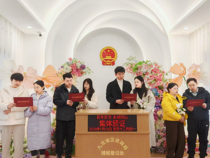 九龙融媒讯(记者 范坤民 摄影报道)寒冬送暖,爱意绵长。1月19日上午,区民政局婚姻登记处颁证室内暖意融融、温馨雅致,四对新人携手齐聚,一场以“‘梅’好姻缘・幸福九龙”为主题的集体颁证仪式在此温情启幕。作为九龙坡区“九龙四季予你”婚俗改革活动的冬季篇章,本次仪式以文明简约的形式为新人婚姻旅程铺就美好开端,让婚俗新风在冬日里传递温暖与力量。