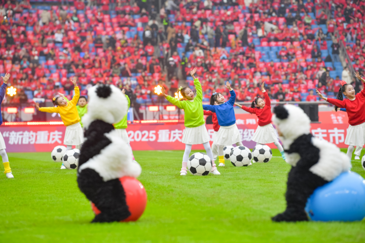 开幕式的暖场环节中,区文化馆抱抱艺术团倾力打造的节目《抱抱地球》惊艳亮相,这支曾登上央视六一晚会、重庆市团拜会的优质团队,将重庆动物园的熊猫元素融入表演,天真烂漫的小朋友们与圆滚滚的熊猫玩偶在绿茵场上相拥起舞,为紧张的赛事氛围注入浓浓暖意。“没想到看球赛还能看到这么治愈的表演,既有竞技的热血,又有生活的温情,太有心了!”现场球迷纷纷举起手机,记录下这温馨时刻。