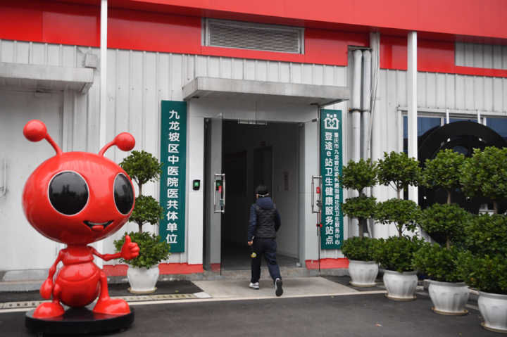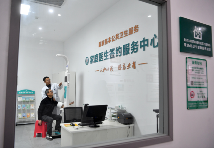 渝州路街道社区卫生服务中心登途e站,医务人员为市民进行身体检测。