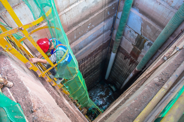 华岩湖上游片区雨污管网整治(一期)工程现场,工人正进入深井准备作业。