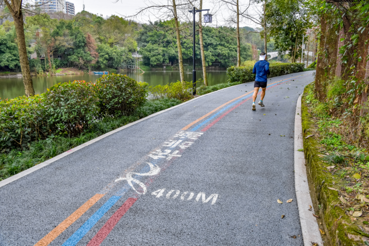 市民在华岩湖步道慢跑健身。