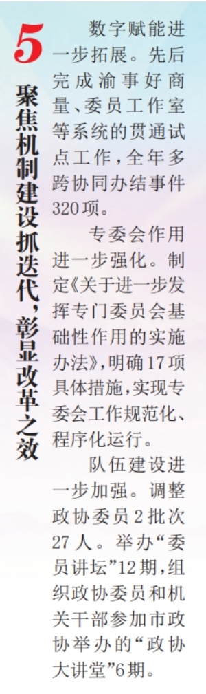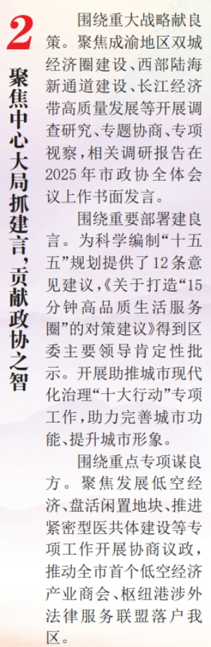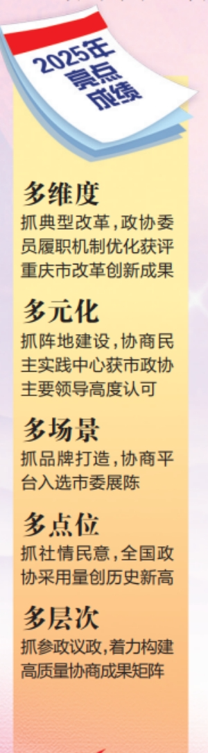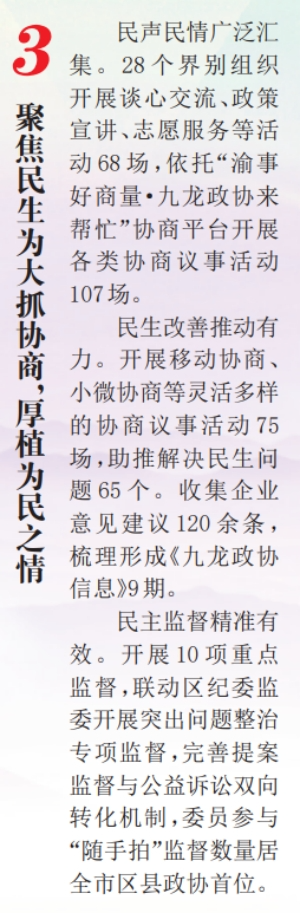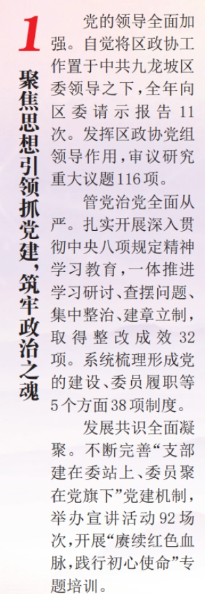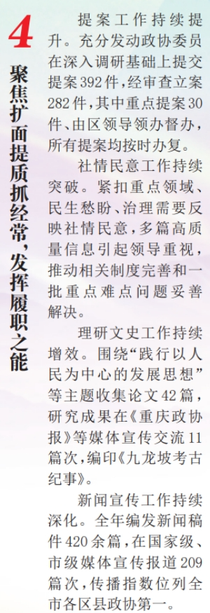 一年来,在中共九龙坡区委的坚强领导下,区政协常委会强化特色党建品牌引领带动,推动民主协商机制改革创新,坚持围绕中心大局资政建言,抓好委员履职平台迭代升级,着力厚植特色、擦亮品牌、做强示范,涌现出一批标志性成果。市政协主要领导来区调研时对区政协党建品牌打造、协商平台建设、社情民意信息等工作给予高度评价,区委主要领导对区政协参政议政精准度和建言献策可行性给予充分肯定。
