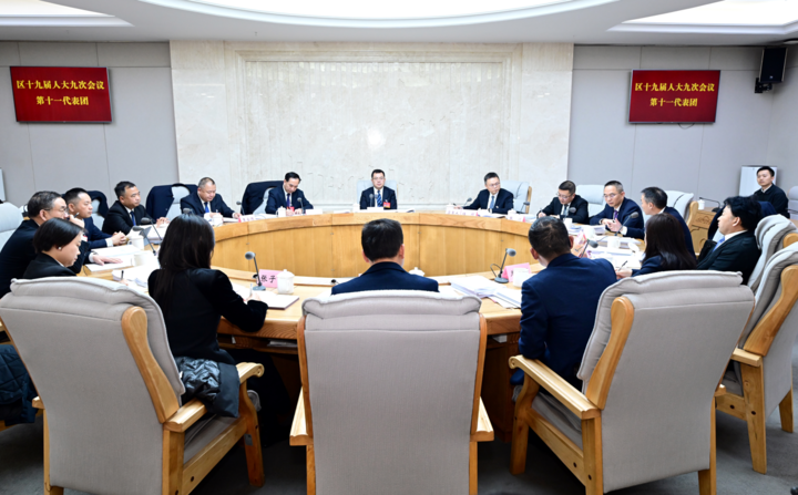 1月21日下午,区委书记覃昌德来到他所在的区十九届人大九次会议第十一代表团,与代表们审议政府工作报告等5项报告和草案,审查区“十五五”规划纲要(草案)、计划报告和计划(草案)、预算报告和预算(草案),讨论酝酿相关工作和名单。