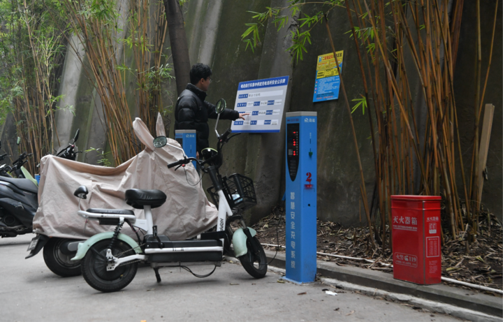 社区网格员检查摩托车充电场所安全公示牌信息。