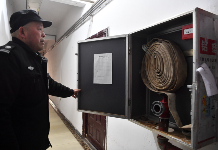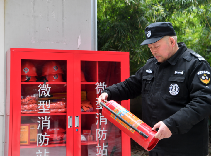 聚金万佳苑小区安保工作人员正在检查灭火器。