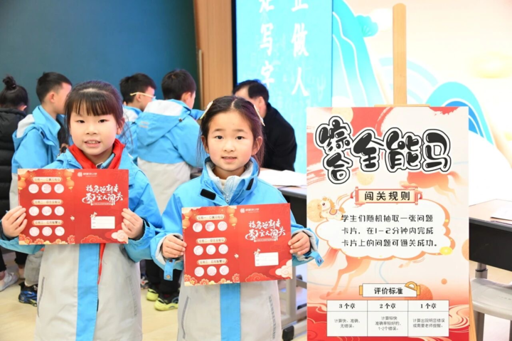 杨家坪小学的“福马迎新春,墨宝大闯关”活动,将新春氛围与测评深度融合。学生手持精美闯关卡,在语文环节专注认读、声情并茂朗读、大胆分享表达;在数学环节快速运算、巧妙拼组图形、灵活解决问题。评委老师根据表现给予印章鼓励,每一枚印章都是对孩子成长的肯定,让测评成为温暖的成长记忆。