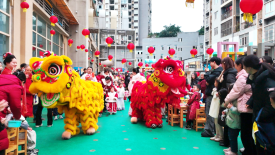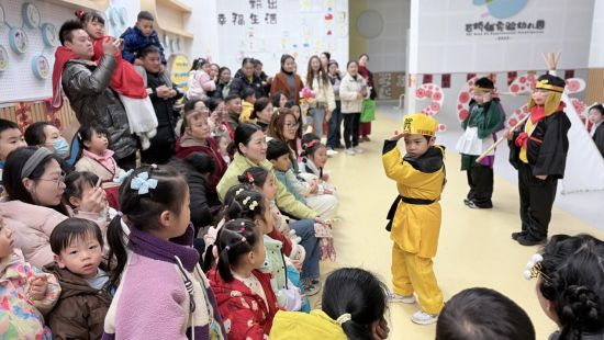 当舞狮队伍在集市巡游并与孩子们互动时,现场气氛被推向了高潮,园内欢呼雀跃,掌声不断。值得一提的是,集市中还设有艺术表演、智力竞赛、模拟交易等多种形式的特色活动。从全园共同起舞的开市仪式,到热闹欢腾的比武擂台赛;再从充满怀旧风情的80年代舞蹈快闪,到创意戏剧《三打白骨精》与优美舞蹈《胡旋舞》的轮番上演;乃至朝代百事通知识问答与拍卖大会的压轴进行,孩子们表现出浓厚的兴趣度。