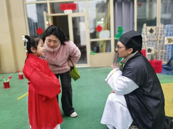 图为孩子与历史人物趣味互动。幼儿园 供图