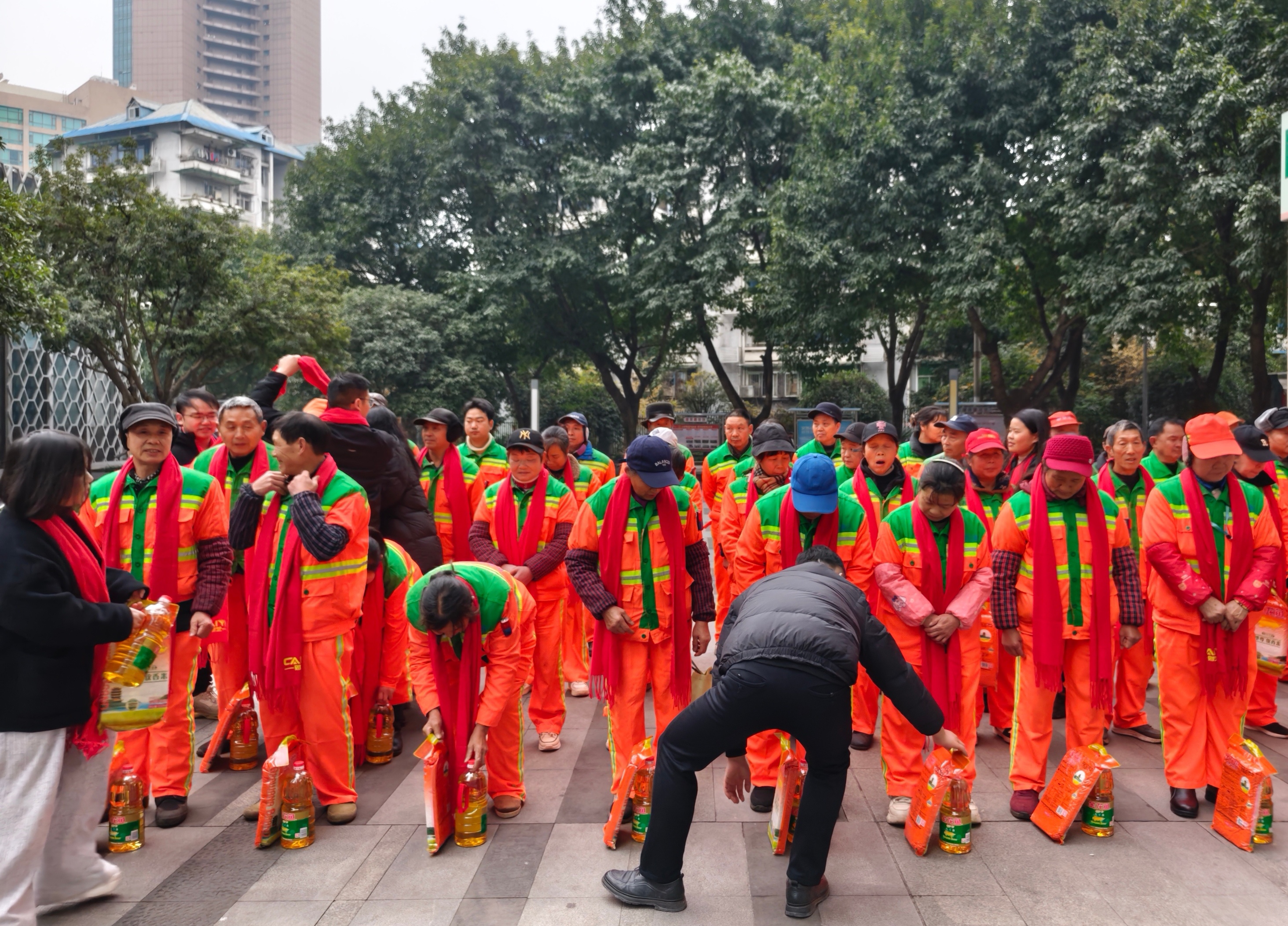 九龙融媒讯(记者 冉冉 摄影报道)1月29日,留创园党群服务中心联合爱心企业开展关爱环卫工人爱心慰问活动,为辖区50名一线环卫工人送上食用油、大米等实用生活物资,以实际行动传递社会温暖,致敬城市美容师。