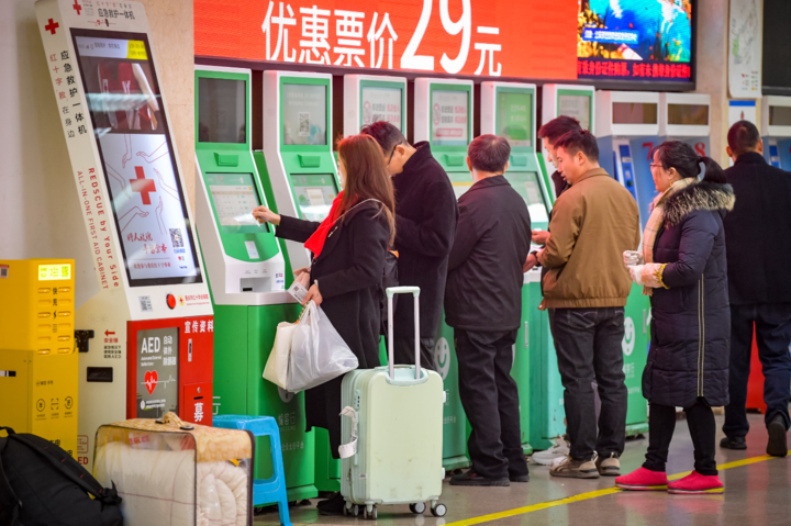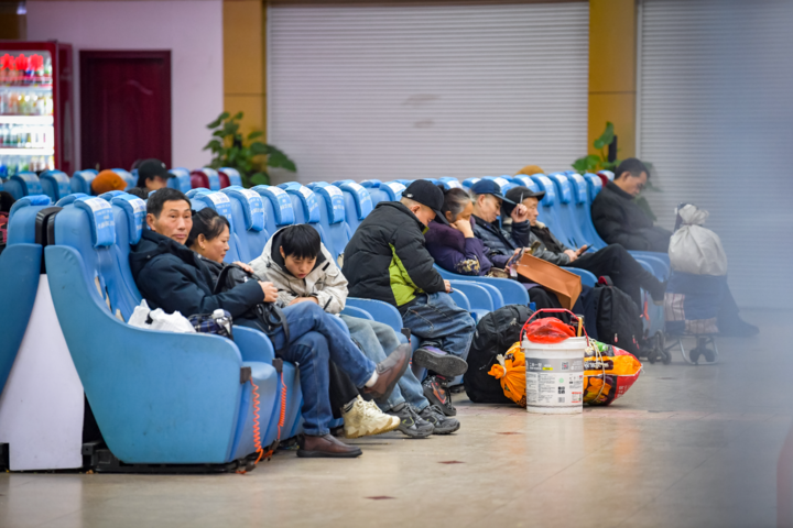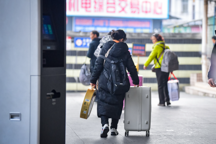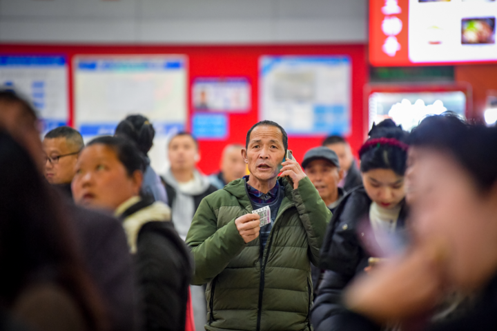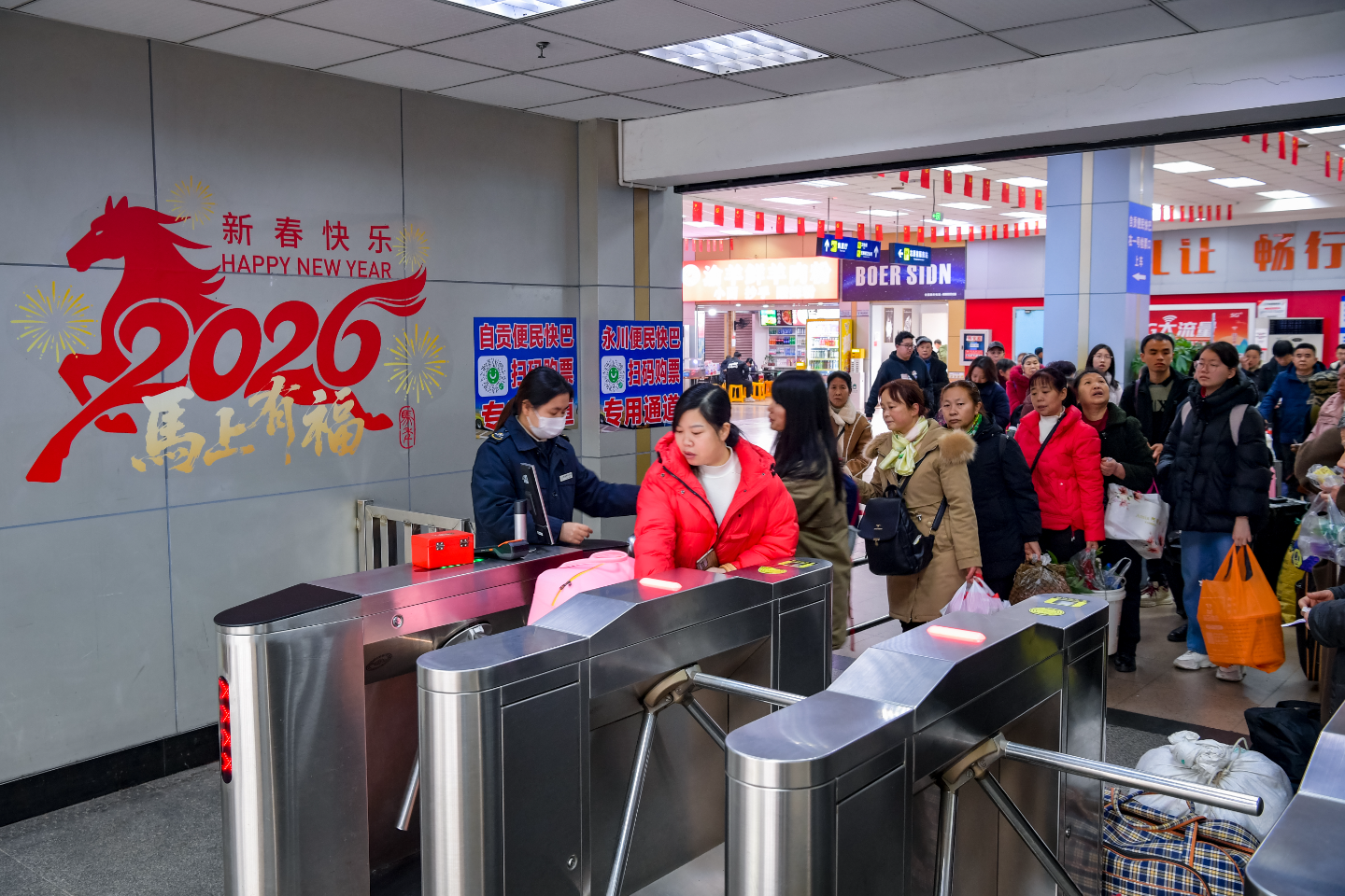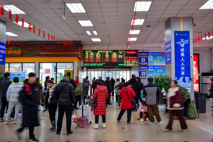 车站检票口贴着喜庆的窗花,旅客们站在电子显示屏前查看候车信息。拖着行李箱的学生,背着大包小包的务工人员,抱着孩童探亲的旅客,每个人眼里都闪烁着同一种期待。