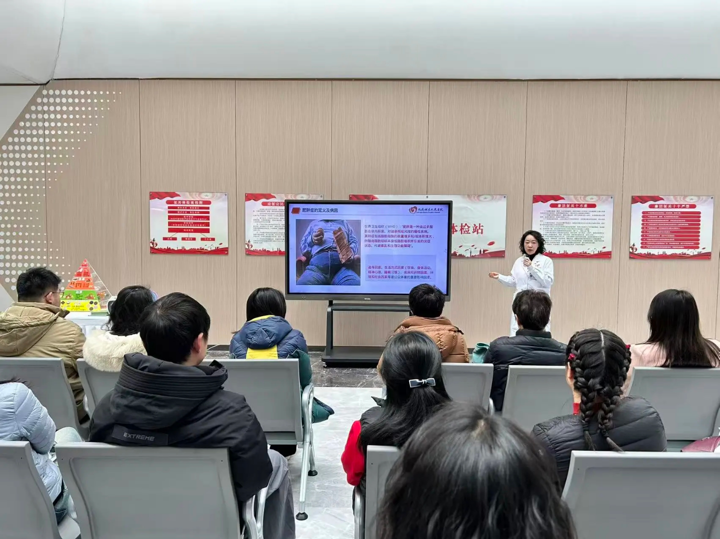 活动现场,皮艳采用营养专业授课、膳食金字塔实物模型演示、互动问答等多样化形式,为群众带来一堂干货满满的健康课程。她从肥胖的定义、病因、流行病学及危害等方面入手,详细阐释了肥胖的鉴别与检查手段,着重介绍了“人体成分分析仪”在体重管理中的应用。随后,围绕医学减重干预、肥胖阶梯治疗以及生活方式干预等核心要点,深入剖析科学减重的关键步骤,并借助膳食金字塔模型直观呈现合理膳食的配比原则,让抽象的营养知识变得通俗易懂。