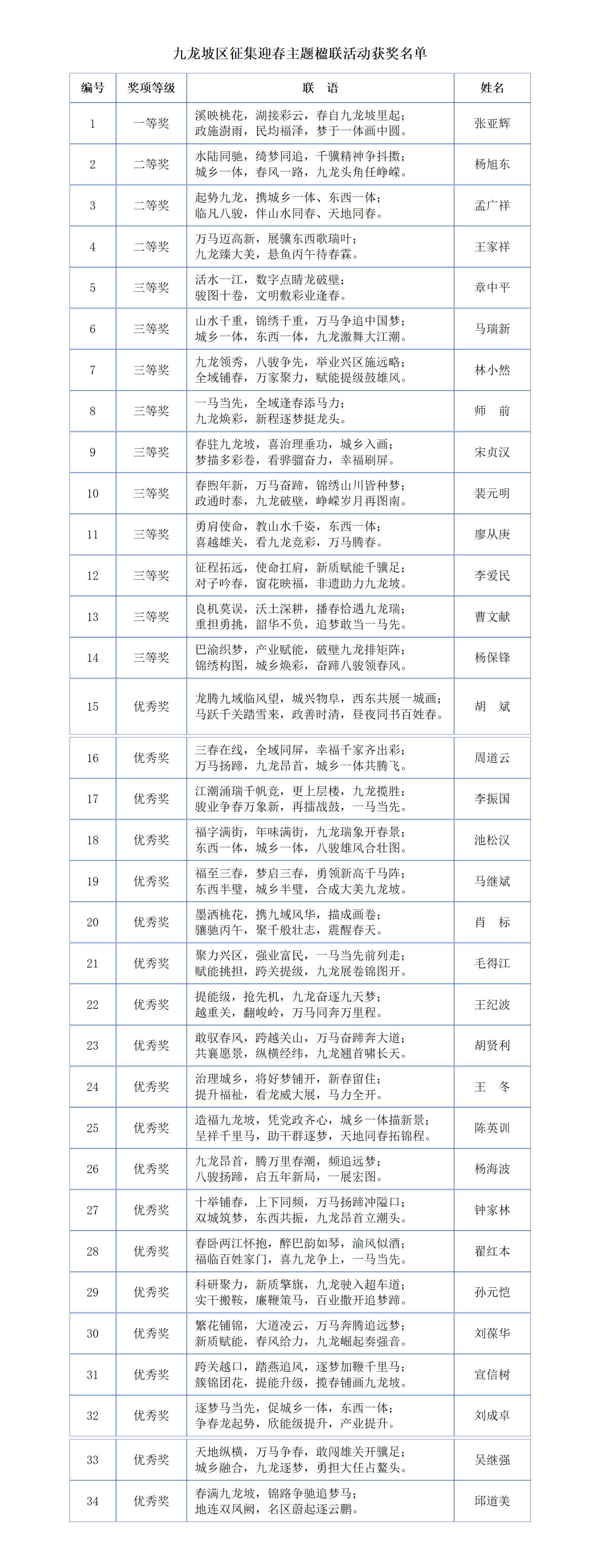 九龙融媒讯(记者 冉冉)2月24日,区文联公布九龙坡区征集迎春主题楹联活动获奖名单,经评审、公示等环节,评选出一等奖1名、二等奖3名、三等奖10名、优秀奖20名。张亚辉荣获一等奖,获奖联语为:“溪映桃花,湖接彩云,春自九龙坡里起;政施澍雨,民均福泽,梦于一体画中圆。”