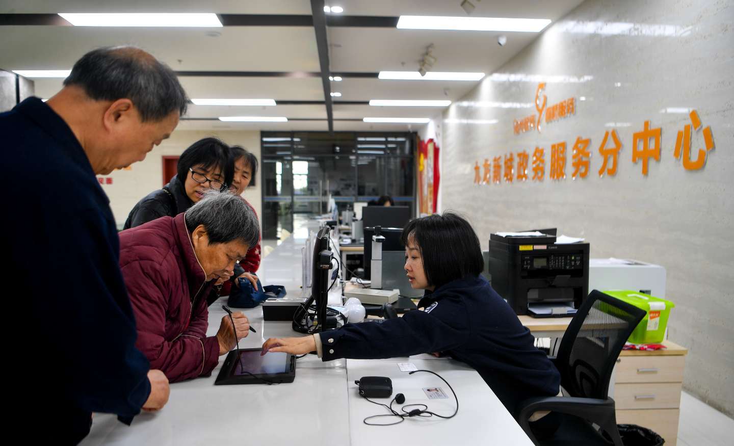 九龙新城政务服务分中心窗口全开,工作人员迅速进入状态,为群众提供高效便捷的政务服务。