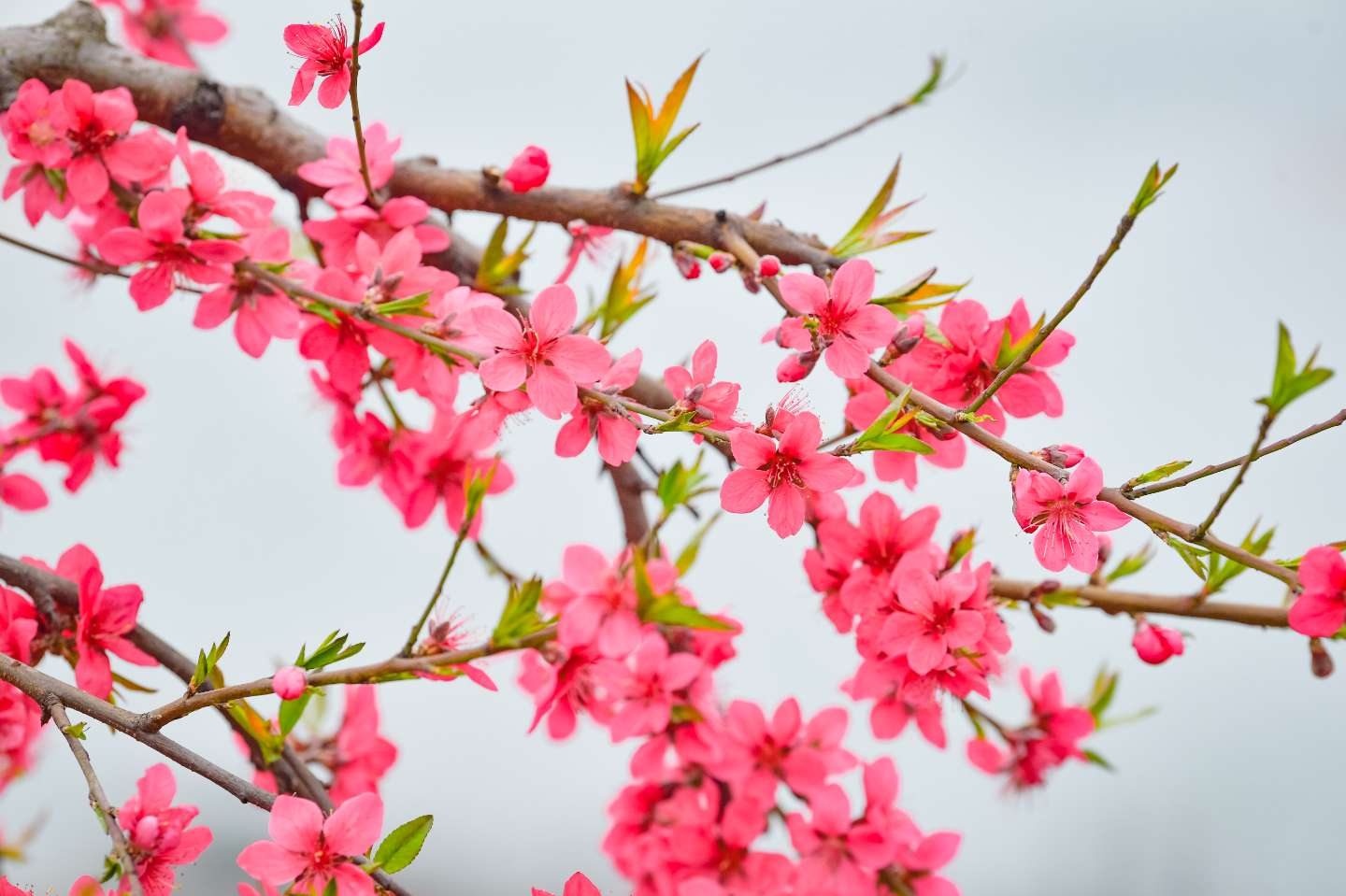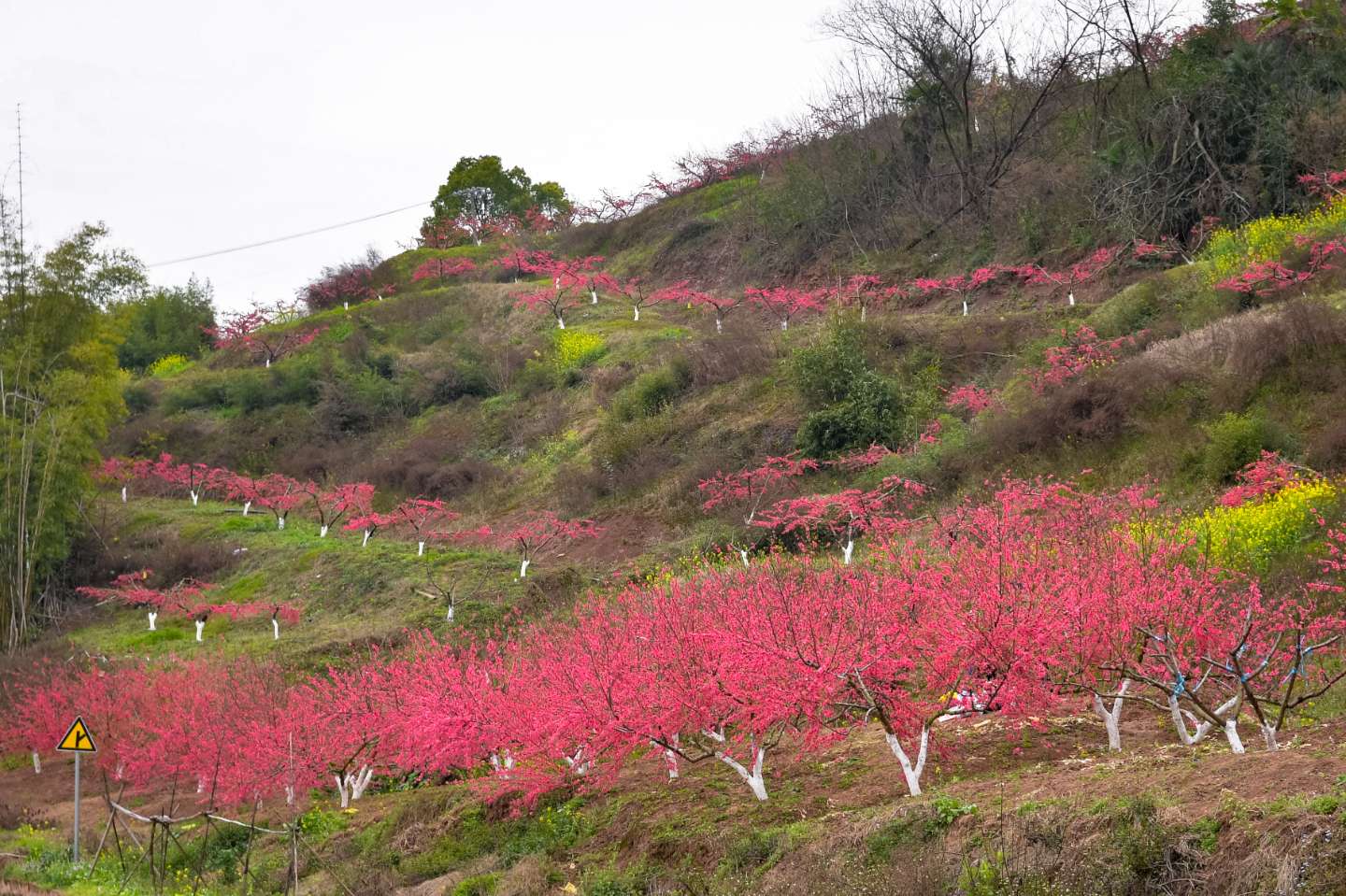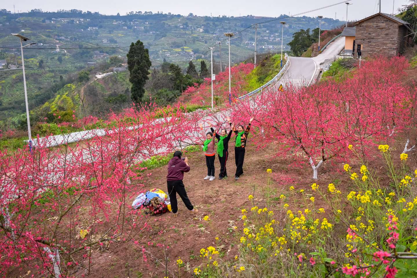 桃林顺着山势层层铺展,连绵成片。田野之上,桃花与油菜花相映成趣,晕染出最动人的春色;山路两旁,桃林与李林交织相拥,为大地披上一袭春日盛装;山头之间,朵朵繁花随风轻舞,春意盎然。