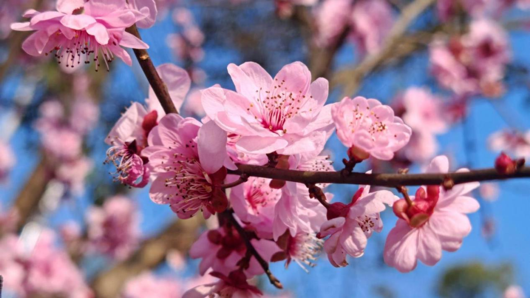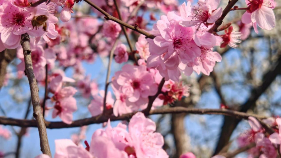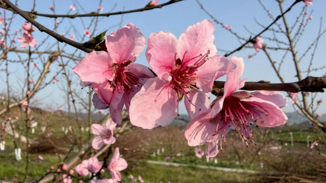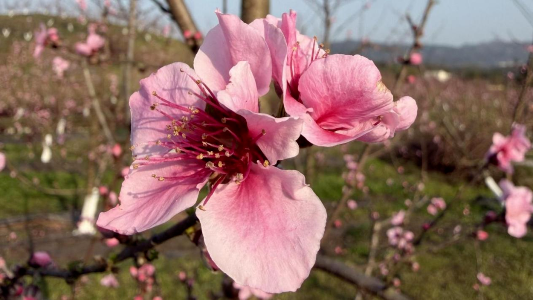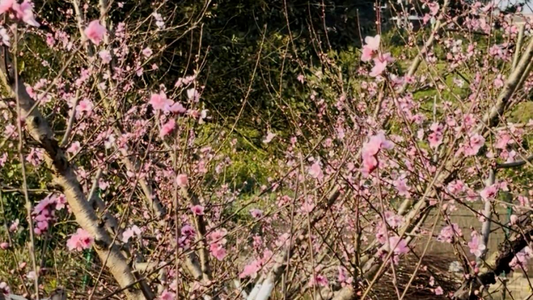 英雄湾的春意,藏在桃花的浅深红粉之间。在和美田园“再见桃林”,数千株桃树依山势而植,粉色的花朵缀满枝头,远望如霞似雾,近看则娇艳欲滴——有的含苞如胭脂点点,有的怒放如云霓舒卷。阳光透过花隙洒下斑驳的光影,蜜蜂在花间穿梭,嗡嗡声织成一片春日的私语。微风过处,花瓣轻旋飘落,铺就一层柔软的芬芳,踏上去,仿佛步步生香。站在桃林高处回望,花影重重,春光正好,令人忍不住驻足,想把这满树繁花都装进记忆里。