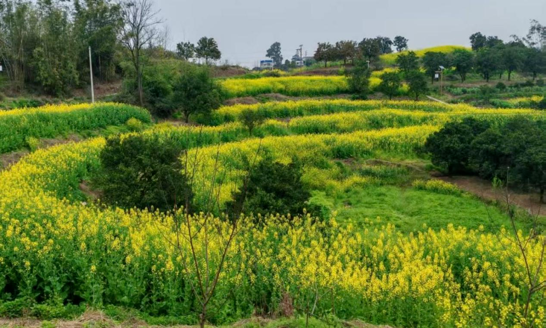 春风吹过铜罐驿,最先醒来的是新合村的田野。在村委会背后,在长寿湾的缓坡上,油菜花正以最热烈的方式回应着春光。它们开得那样热烈,那样不加掩饰——春风过处,花浪翻涌,细碎的花瓣在阳光下闪着金光。晨光微露时,花瓣上还挂着露珠,晶莹剔透;待到午后阳光斜照,整片花田便镀上了一层温暖的光晕。站在田埂上,闭上眼,只听得见蜜蜂振翅的声音,和风吹过花梢的细响。这方土地上的油菜花,不争奇斗艳,却自有其质朴的热烈,恰如春日乡野最真诚的邀约。
