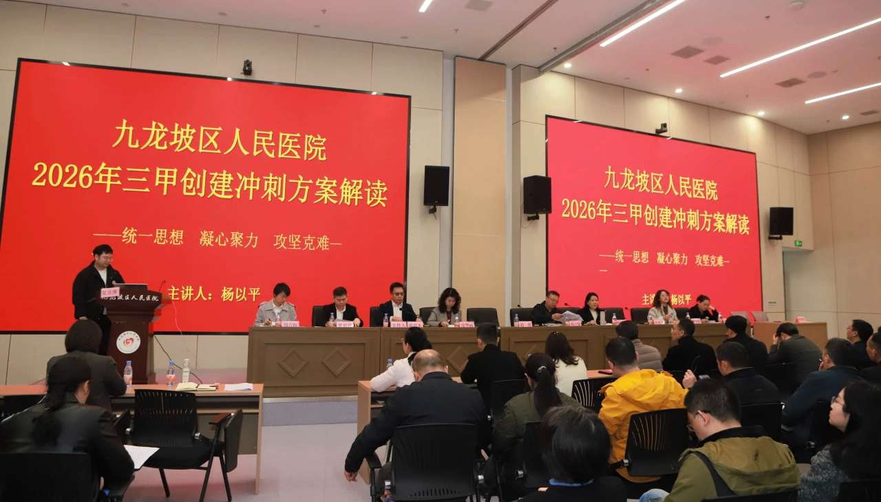 九龙融媒讯(记者邬姜)2月26日,新春伊始,区人民医院召开2026年三甲创建冲刺大会,区领导、区卫生健康委及区人民医院总院、区中西医结合医院、医共体班子成员、医院中层干部共计130余人参会。