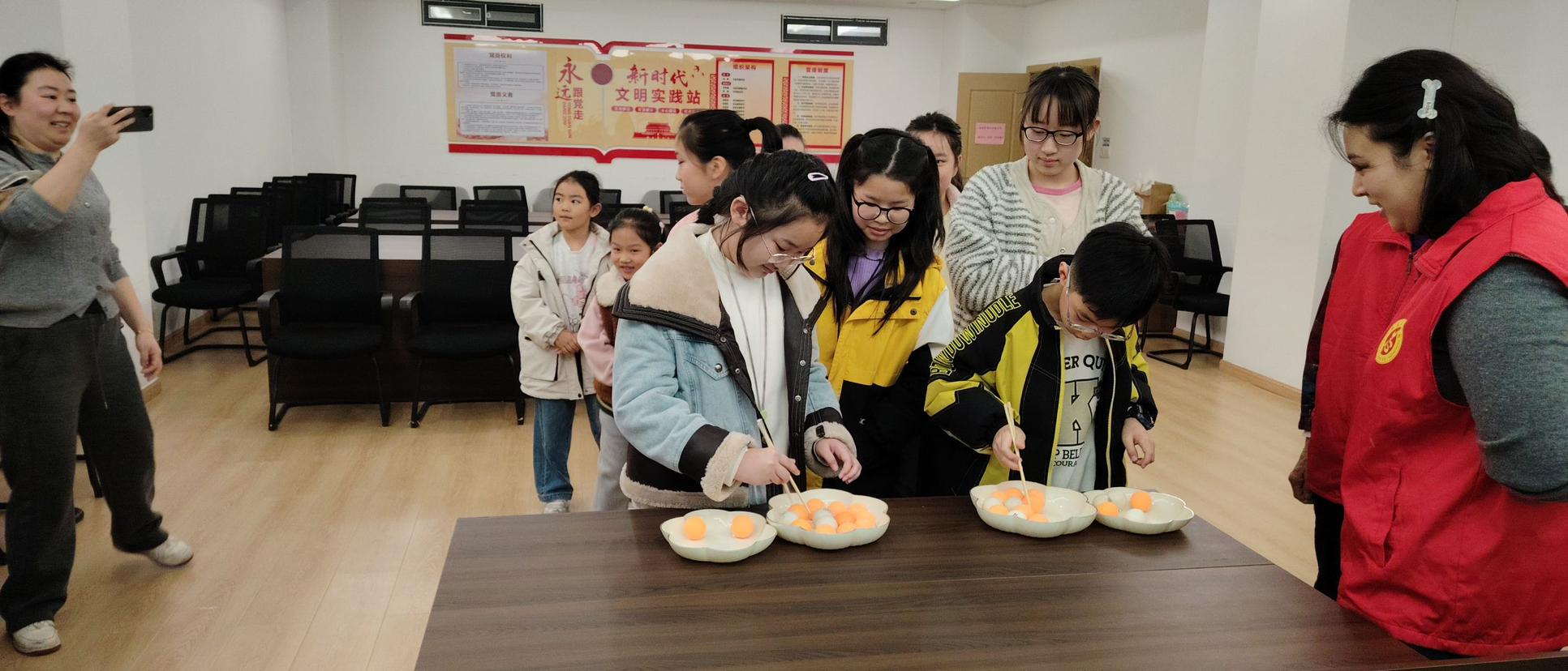 活动现场热闹非凡,设置了投壶、套圈、夹“元宵”等传统游戏。投壶区前,孩子们手持竹箭,屏气凝神瞄准壶口轻轻投掷,每一次命中都引来阵阵欢呼;套圈区里,孩子们蹲下身子,手中的圆环划出一道道弧线,套中玩偶时的雀跃神情感染着在场的每一个人;夹“元宵”挑战赛更是人气满满,孩子们用筷子将漂浮在水盆中的乒乓球夹起,锻炼手部精细动作的同时,也体会到了传统游戏的乐趣。