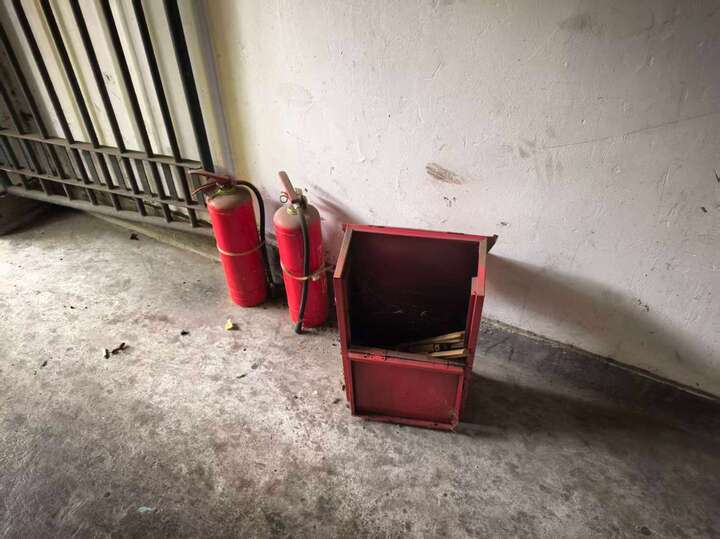 灭火器未按规定放置专用箱内,配套灭火器箱箱体破损、内部积尘结网
