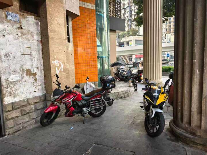 摩托车违规占用人行道乱停乱放,地面散落垃圾杂物