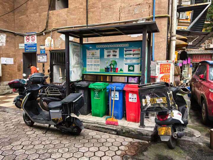 垃圾分类点宣传海报破损、摩托车违规占道乱停乱放
