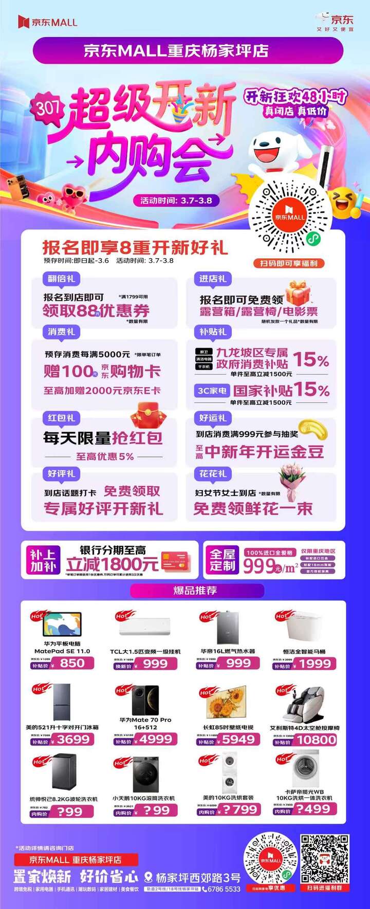 活动福利覆盖消费全流程,十大重磅礼遇层层叠加,优惠力度拉满。补贴礼方面,手机、电脑、空调等大家电可享15%国家补贴,家居、厨卫、清洁电器等可享15%九龙坡区政府补贴,单件至高立减1500元,政企双补直接让利消费者;进店礼诚意满满,预存到店即可免费领取签到好礼一份,露营装备、电影票等免费送,同时京东MALL联合九龙坡区妇联等,推出女性节日专属礼派送、女性用品集市优惠及公益咨询等特色活动,献礼女性消费者。