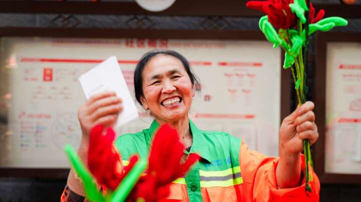 清扫结束,少先队员们拿出之前做好的小红花,纷纷递到环卫工人面前。“阿姨,这是送给您的。”“谢谢您让我们的社区这么干净!”接过花的瞬间,环卫工人们露出朴实的笑容。有人把花举起来端详,有人轻轻摸了摸花瓣,有人笑着说:“活了这么大岁数,还是头一回收到花。”那些被风吹日晒的脸上,笑容比春天还暖。