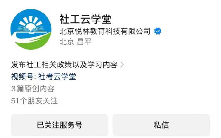 1.微信服务号搜索:社工云学堂,并关注服务号。
