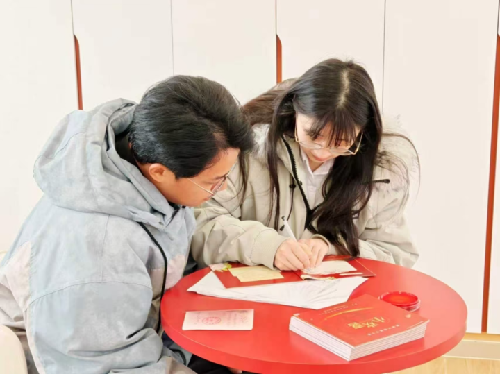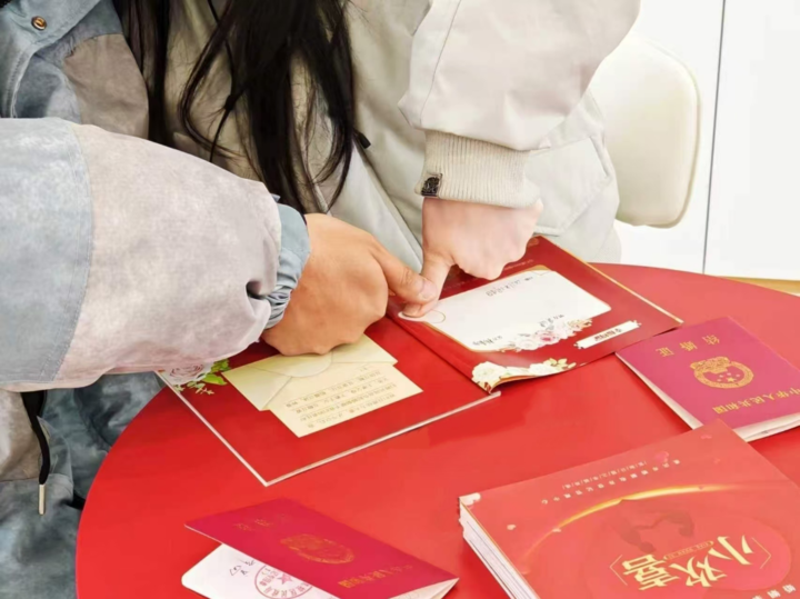 手写幸福约定,红手印定格美好期许。在“幸福约定”环节,新婚夫妻拿起纸笔,在“小欢喜手册”上写下对彼此、对小家的美好寄语。“三餐四季,岁岁相伴”“风雨同舟,不离不弃”……简单的文字里,藏着最真挚的爱意,满是对未来生活的憧憬与向往。落笔之后,夫妻双方共同按下鲜红手印,成为二人之间独有的珍贵约定,也象征着从此携手并肩、同心同德,共筑幸福家庭。