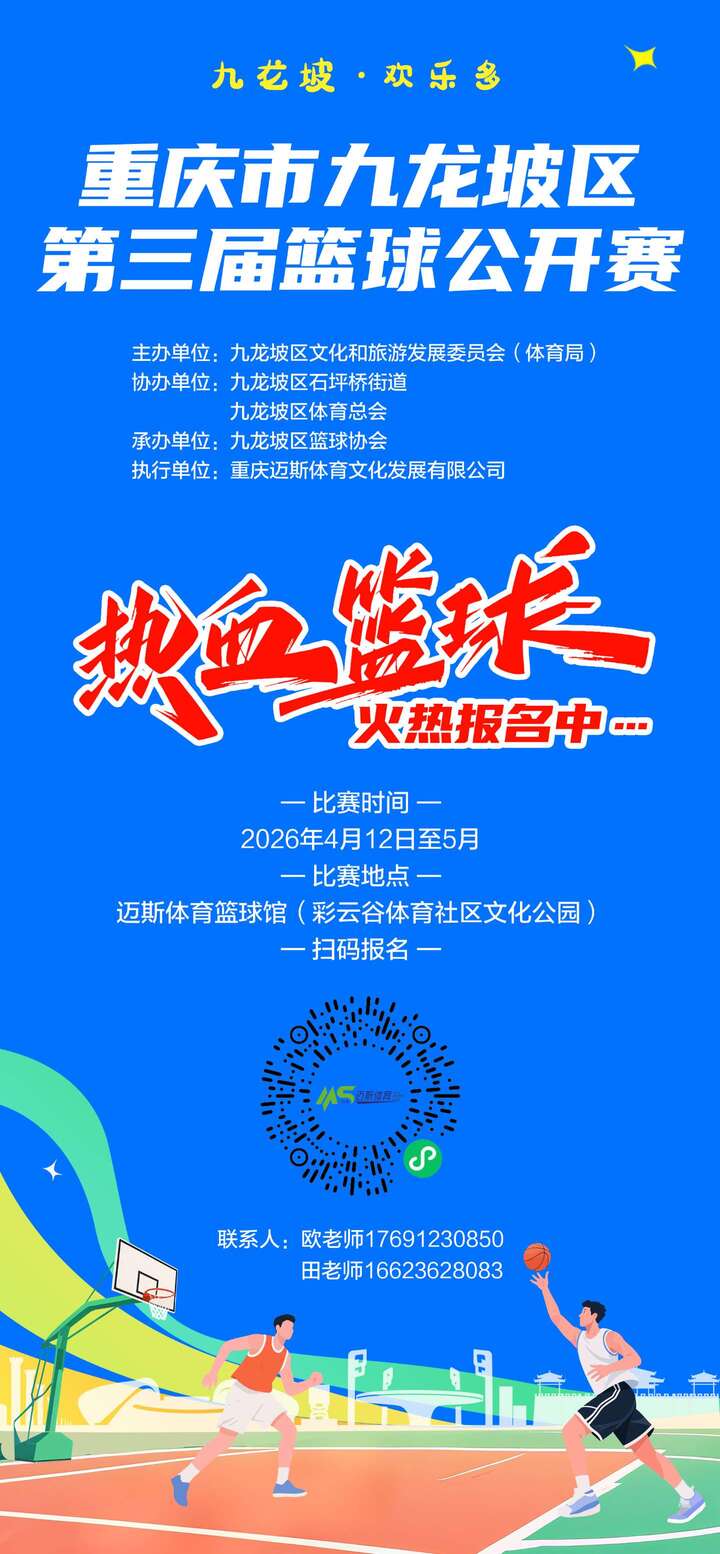 九龙融媒讯(记者 范坤民)热血篮球,燃动九龙坡!记者从区文化旅游委(体育局)获悉,九龙坡区第三届篮球公开赛即日起正式启动报名,赛事将于4月12日至5月期间,在迈斯体育篮球馆(彩云谷体育社区文化公园)拉开战幕,为广大篮球爱好者搭建切磋技艺、交流互动的专业平台。