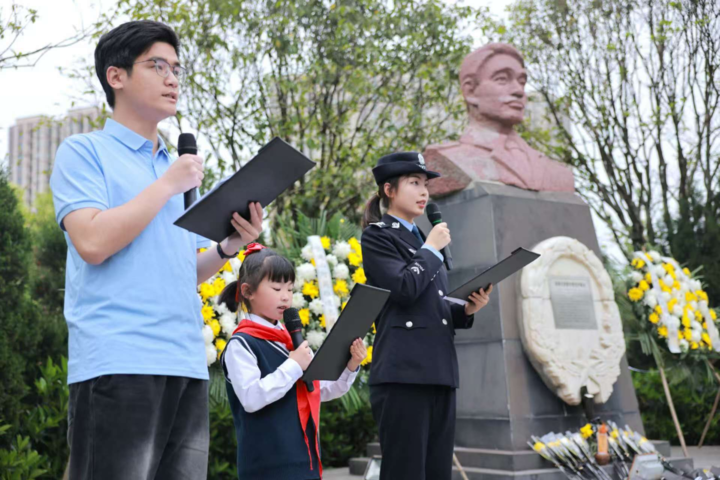 “今天,我们站在你的塑像前——藏蓝的警服,法治的信仰,红领巾的纯真。你未走完的路,我们正接力前行。”青年民警与学生一同朗诵的《致芦振龙烈士——清明祭·忠诚颂》,让27年前那场壮烈搏斗再次浮现:1999年5月27日,时任石桥铺派出所户籍民警的芦振龙,在传唤嫌疑人时遭7名歹徒持刀袭击,身负21处刀伤仍5次挣扎起身试图制敌,最终牺牲时年仅25岁,同年被追授“全国公安系统一级英雄模范”称号。
