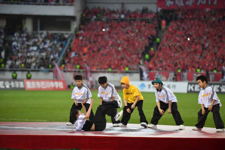 重庆巴川中学啦啦操团队带来《快乐小马》的活力开场,轻快节奏、灵动舞步瞬间点燃全场,用青春气息诠释“快乐足球”的内涵。紧接着,云阳县特殊教育学校“萤河计划”乐队登台演唱《夜空中最亮的星》。全场观众自发打开手机手电筒,点点星光汇聚成璀璨星河,纯净歌声与温暖光影打动现场每一个人,展现渝超联赛包容与温暖的底色。