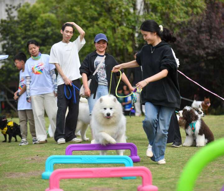 轻快灵动的绕杆竞速里,狗狗迈着小步灵活穿梭障碍,主人紧紧牵引默契配合;童趣满满的宠物123木头人游戏中,毛孩子乖乖定格不动,软萌模样逗得全场阵阵欢笑;穿插互动小游戏暖心串联全程,没有激烈竞技比拼,只有陪伴与欢乐。大小萌宠肆意撒欢奔跑,主人温柔陪伴引导,一人一宠步调一致、双向奔赴,在阳光草坪间定格无数温馨治愈瞬间,尽显人与宠物和谐相伴的美好模样。