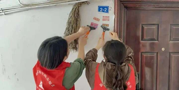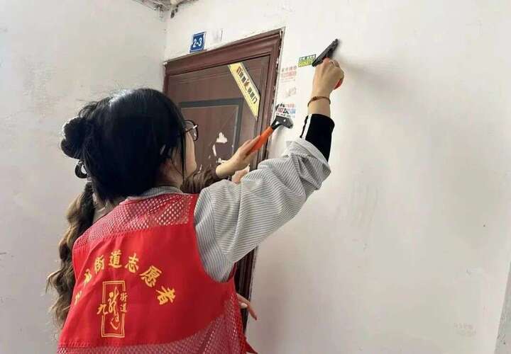 行动现场,全体参与人员分工协作,迅速投入到楼道清洁工作中。大家手持铲子等清洁工具,聚焦楼道墙面、墙角、安全栓等重点区域,精准发力破解卫生难题。志愿者们耐心细致,用铲子小心翼翼铲除墙面违规小广告、顽固污渍和安全栓表面的污垢,用汗水践行志愿责任,全力改善楼道环境。